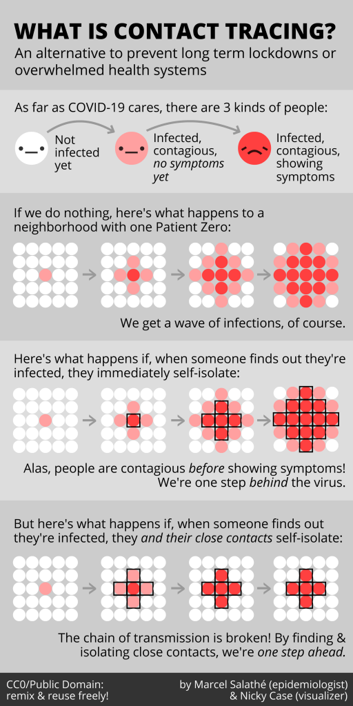One of the exemplars of the effectiveness of contact tracing is the state of Alaska. Despite its vastness and lack of infrastructure, health officials there have contact-traced every single reported case of Covid-19 since the outbreak began. Alaska has the third lowest per capita rate of infections. Their methodology can be read in more detail here. They have hired nurses that call the infected person and ask them a list of questions with the goal of first building a timeline of their illness to figure out when they were most contagious. They then attempt to get the patient to recall each and every person they came into contact with during their infectious window including the name and contact info. The contact tracers then contact that person and tell them they were exposed and should quarantine. It doesn’t have to be nurses, anyone can do it.