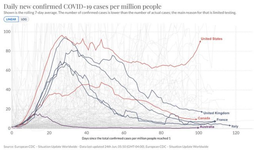 It has become clear that the issue of masking has irritated those who are sensitive to any encroachment on individual liberties. This is understandable but has led to mask wearing turning into a political issue. This is a shame because what we have clearly seen in the past few weeks in many parts of the country is that the virus doesn’t care about politics. It doesn’t care if you believe it is gone. If restrictions are eased without good mask wearing (along with distancing and contact tracing) the numbers all go up. This graph tells the story: