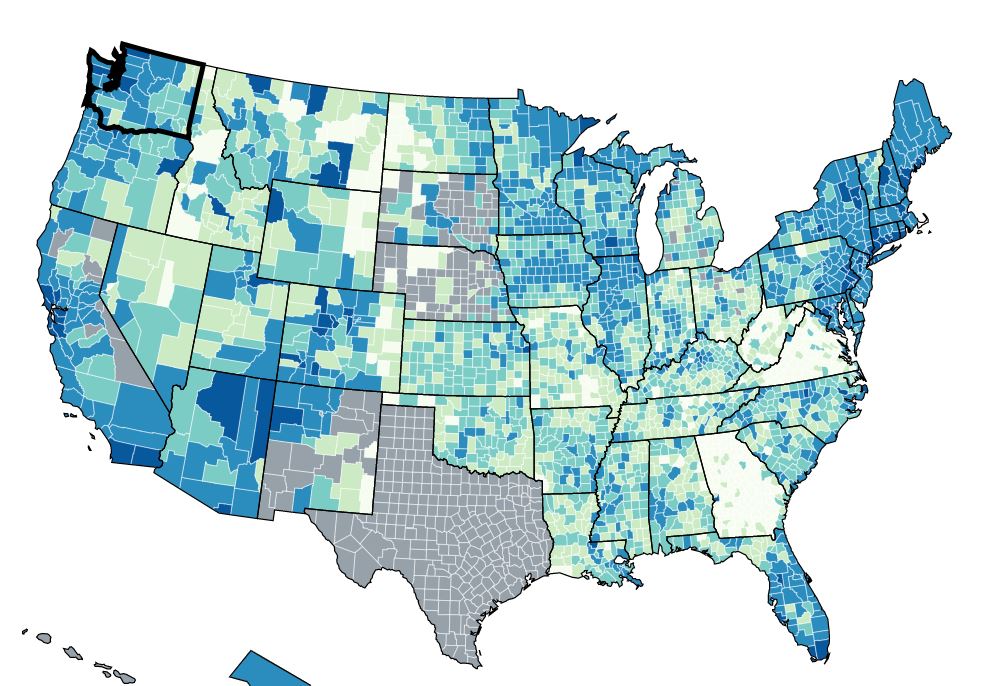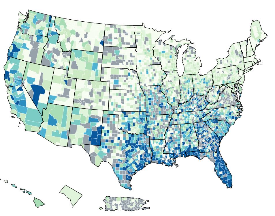 The picture on the right shows the percentage of hospital beds are filled with COVID patient (source: CDC.gov 8/27/21). The picture on the left shows vaccination rates (where reported, source: CDC.gov 8/27/21). By using hospital utilization as opposed to cases you show the true burden of disease.