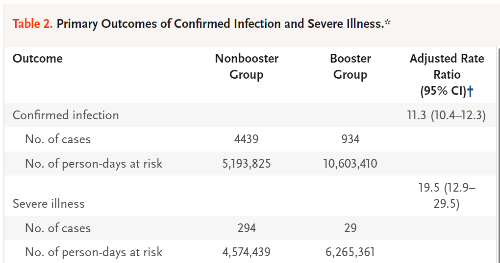 You can see from these numbers that the risk of infection is 11.3 times higher and the risk of severe infection is 19.5 times higher in the group that did not get the booster. They estimated vaccine efficacy of 95% with the third dose. The booster worked in this population and probably did as well in younger individuals as well.